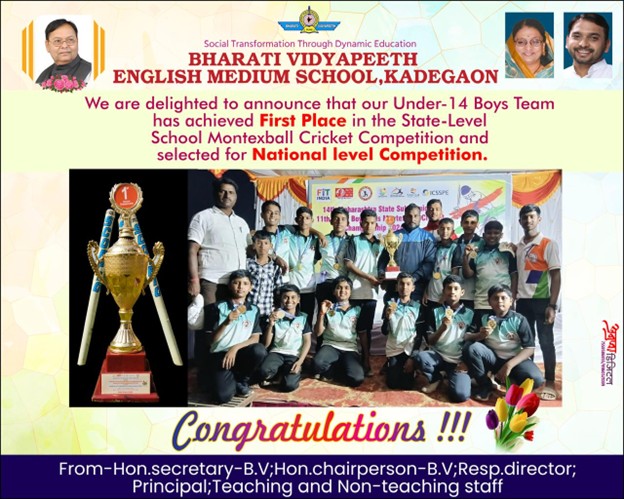 A very very proud and happy moment for Bharati Vidyapeeth English Medium school, Kadegaon. Our school's under 14 team won "First place" in National level Montexball cricket match held today at Gondia. A huge Congratulations to the entire team and PT teacher Mr.Rohit patil from Hon.Dr.Vishwajeet Kadam-Secretary- BV pune, Hon.Vijaymala Kadam- Chairperson BV Schools-pune and all dignitaries of Bharati Vidyapeeth for this incredible success.